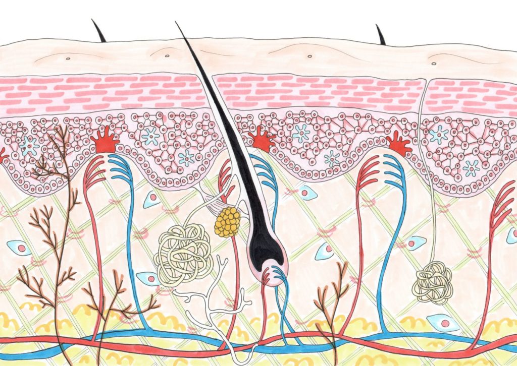 この基底層と真皮の間には『基底膜』という薄い一枚の膜があり、この基底膜が真皮の血液から酸素や栄養素を吸収し、基底膜の細胞へ届け新しい皮膚をつくります。